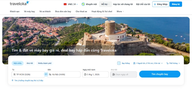 Trong số các nền tảng hỗ trợ tra cứu và đặt vé máy bay hiện nay, Traveloka được đánh giá là một trong những lựa chọn uy tín khi cần check giá vé máy bay VietJet nội địa. Traveloka là đại lý vé máy bay Vietjet chính hãng, vì vậy mức giá hiển thị trên nền tảng này luôn được cập nhật sát với giá thực tế của hãng, đồng thời minh bạch đầy đủ các khoản thuế và phí. Điều này giúp người dùng dễ dàng nắm được tổng chi phí cần chi trả ngay từ đầu, hạn chế tình trạng phát sinh chi phí ngoài dự kiến.