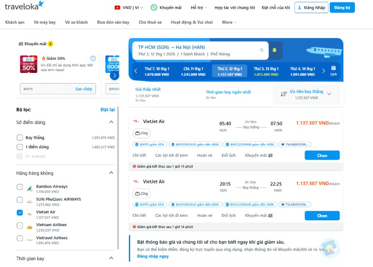 Một ưu điểm lớn khiến nhiều người lựa chọn Traveloka là khả năng so sánh giá vé linh hoạt. Chỉ với một lần tìm kiếm, bạn có thể xem được giá vé VietJet trong nhiều khung giờ và nhiều ngày khác nhau, từ đó nhanh chóng nhận ra đâu là thời điểm có mức giá tốt hơn. Tính năng lọc hãng bay, lọc khung giờ và mức giá cũng giúp việc check giá trở nên nhanh gọn, đặc biệt phù hợp với những người không có nhiều kinh nghiệm đặt vé máy bay.