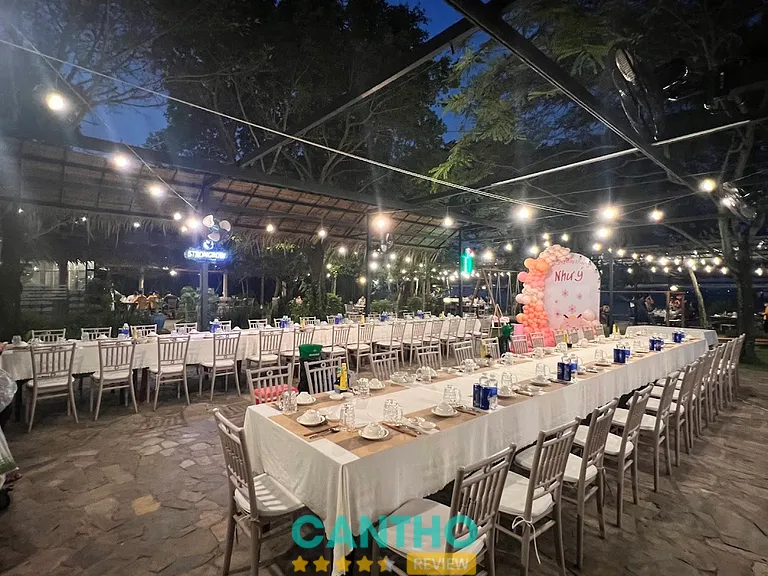 Đặc biệt, nếu bạn ghé nhà hàng vào buổi chiều tà, khung cảnh hoàng hôn rực rỡ buông xuống mặt sông lấp lánh, xa xa là cầu Cần Thơ lên đèn rực rỡ, chắc chắn sẽ là một bức tranh thủy mặc tuyệt đẹp khắc sâu vào tâm trí. Bạn hoàn toàn có thể tản bộ dạo quanh khuôn viên rộng lớn này, tận hưởng gió trời mát rượi ngay cả giữa ban ngày.